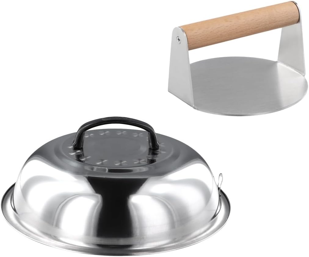 Color: Silver Material: Stainless Steel, Bakelite, Wood Package Size: 12.2 * 12.2 * 3.9 inches Package Includes: 1 * Melting Dome, 1 * Burger Press Note: - Please refer to the measurement. Tiny measuring error is allowable in normal range. - There might be a little color difference due to the monitor, camera or other factors, please refer to the physical item.