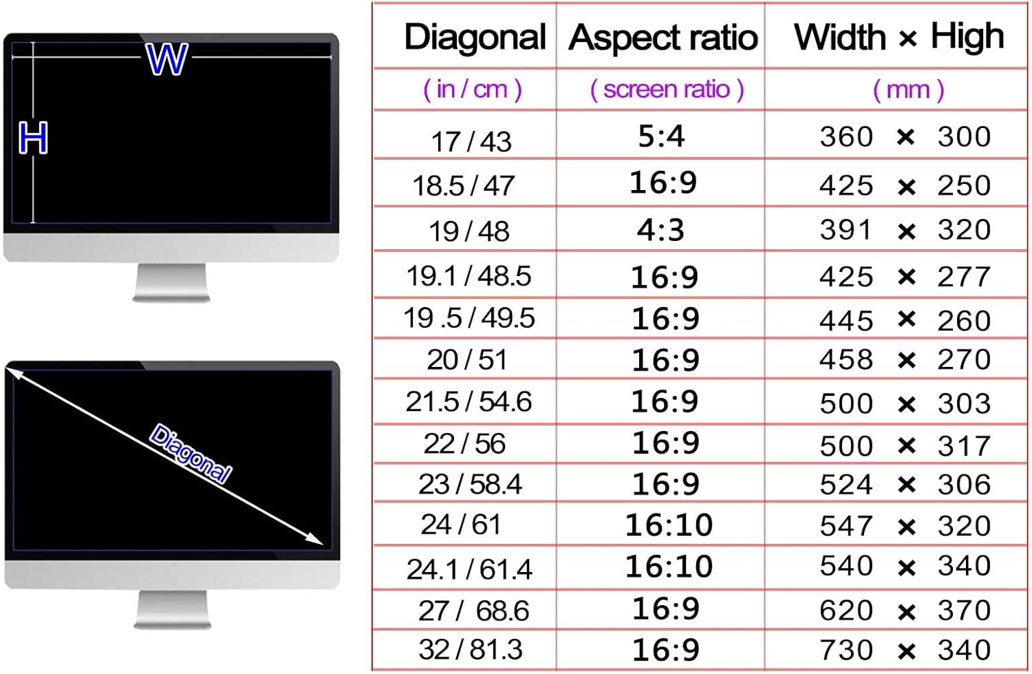 17-32 Inch (DIAGONAL) Computer Blue Light Screen Protector For Eye Strain, Antis Blue Light,Scratch Resistance Widescreen Monitor Filter PC Hanging Type For Desktop Monitor Ultra-thin to 2mm, 95% transparency, will not darken your computer screen, keep the original screen color. When you work for a long time, our high-definition computer monitor screen protector will help relieve eyestrain and stress 【Product name】: Computer antiblue light screen protector Material: acrylic Screen Surface: Matte shape: rectangle 【screen size】 Diagonal (W×H): 17in/43cm(360×300);18.5in/47cm(425×250);19in/48cm(391×320);19.1in/48.5cm(425×277);19.5in/49.5cm(445×260); 20in/51cm(458×270);21.5in/54.6cm(500×303);22in/55.9cm(500×317);23in/58.4cm(524×306);24in/61cm(547×320);24.1 in/61.4cm(540×340);27in/68.6cm(620×370);32in/81.3cm(730×340) Thickness: 2mm Buckle width: 1.6cm/0.63in Installation methods: hanging (removable, reusable) Applicable computer brand: common to all brands Applicable products: laptop/desktop computer monitors Special Features: AntiBlue Light, Block UV, AntiGlare, AntiFingerprint, AntiScratch and Wear-Resistants, Water-Resistants, Easy to Install, No Drop, Customized Size Select the protective film size: If you're not sure about your desktop screen size, just grab a tape measure and measure screen width and height measurements (including bezels), use your measurements to choose the correct screen protector size Package Contents: Computer Screen Protector × 1 Precautions: 1. Since the product is measured by hand, the size may have an error of 1-3mm, please refer to the actual product 2. Due to the difference in light, environment and display, there will be a certain color difference between the product and the picture, please refer to the actual product 3.