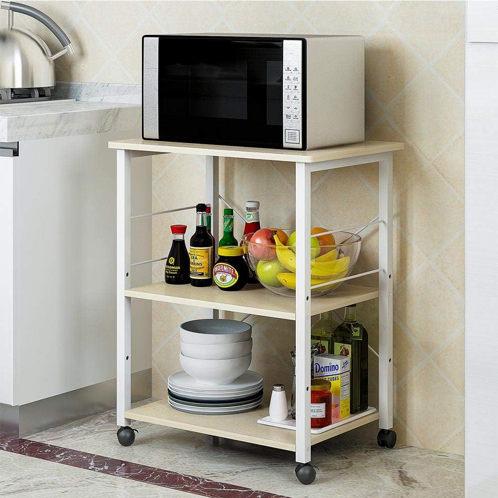 Color:White Features: Comes with 3-tier design, this storage rack is ideal for keep your kitchen organized and gives you more space. It features 2 useful sides hook-rail with hooks to easily hang your gloves, utensils and gadgets; meanwhile it frees up the storage rack space for you to stash more items. Wheel design,convenience to move from place to place Assembling this microwave storage rack is a totally hassle-free to do, for you don’t need to dig out your tools to set it up in a few minutes. Specifications: Material: Medium Density Fiberboard (MDF) Overall dimension: 24" x 16" x 29" (L x W x H) Weight: 17.6 lbs Tips: Some assembly may be required, we provide install tool, please see product details. If there is any questions, be free to contact with us at any time.