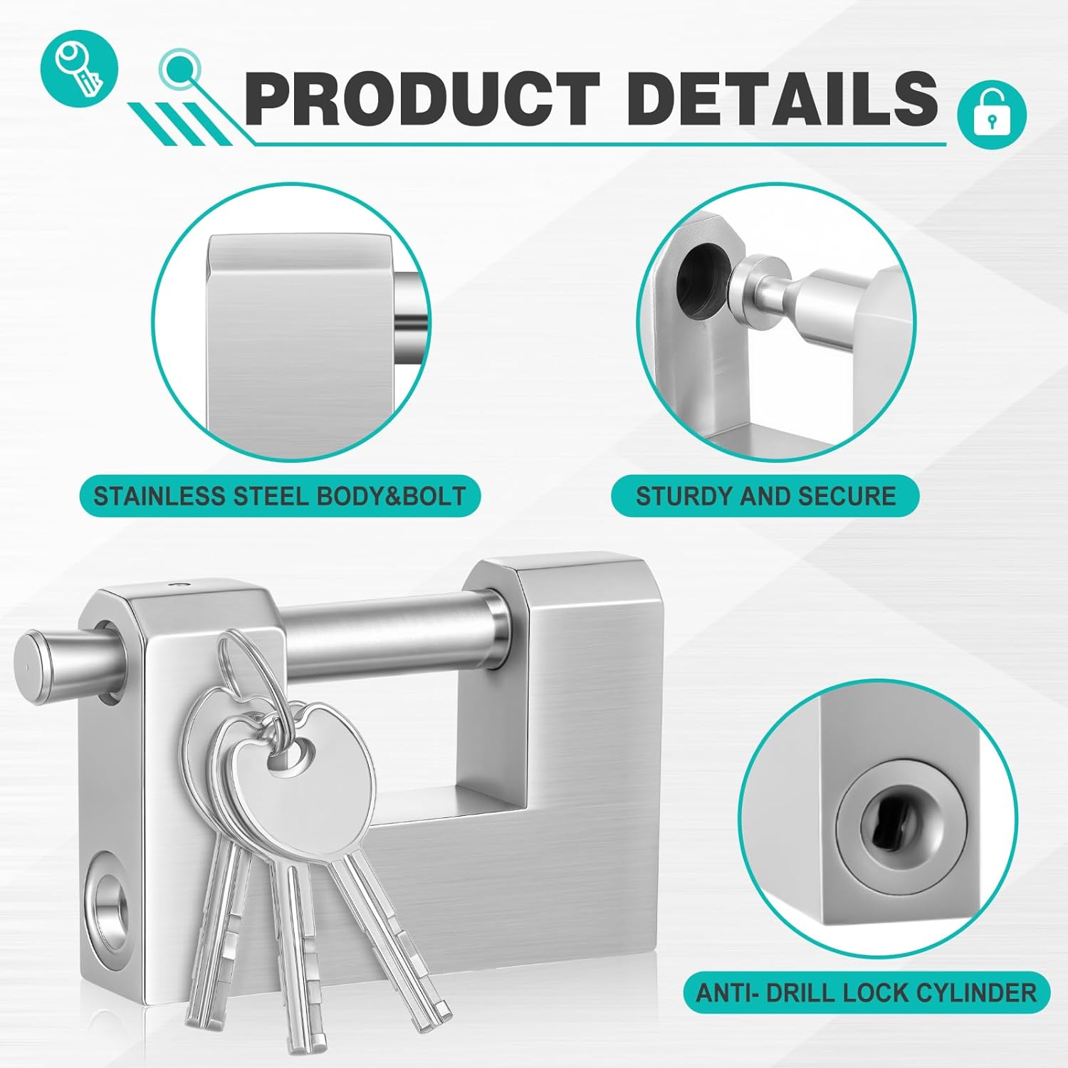 Features: Designed to endure diverse weather conditions, these container lock perform reliably in harsh outdoor environments while maintaining security and integrity, regardless of rain or shine The storage unit lock's fully rotating stainless steel chain offers a completely enclosed locking mechanism, eliminating weak points and preventing cutting or sawing attacks to keep assets secure. Specifications: Material: stainless steel Color: silver Size: 3.15 x 1.97 x 0.79 inches/ 8 x 5 x 2 cm Package includes: 2 x D-shaped locks 3 x Keys Notes: Manual measurement, please allow slight errors on size. The color may exist a slight difference due to different screen displays.