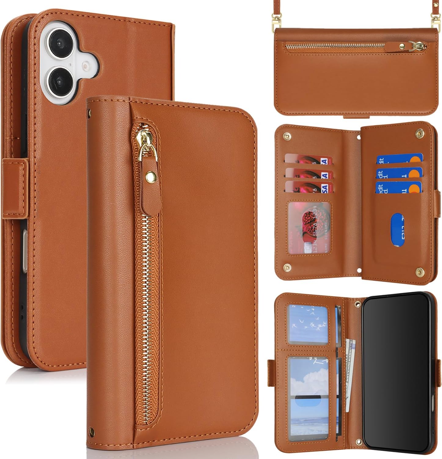 SunYoo for iPhone 16 Wallet Case for Women,for iPhone 16 Case with Strap Crossbody Lanyard,PU Leather Shockproof Card Holder Stand Zipper Pocket Flip Phone Cover-Brown