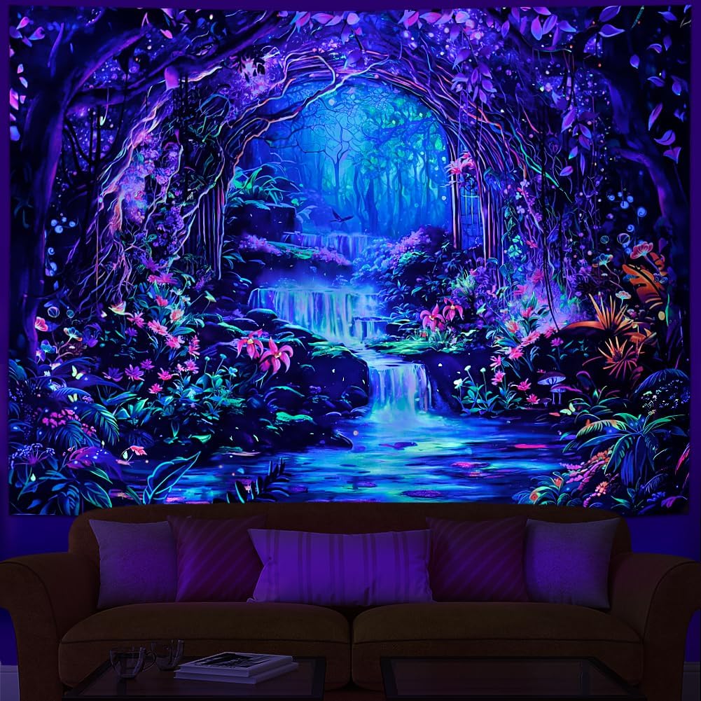 Under UV or blacklight, the magical forest bursts into vivid glow. By day, enjoy its rich, colorful design of a whimsical forest scene; by night (or under blacklight), witness a dazzling transformation. Made from soft, durable polyester, it’s fade-resistant and easy to hang. Perfect for bedrooms, living rooms, dorms, or party backdrops. Specification: - Material: 100% Polyester fiber, elastic material. - Size: M-130cm * 150 cm/H51.2"×W59.1"; L-150cm * 200cm/H59."1×W78.7"; XL-180cm× 235cm/H70.8" × W92.5". - Usage: Ideal for bedrooms, living rooms, game rooms, or even as a unique gift for friends and family. This tapestry appeals to a wide range of interests—from art lovers to space aficionados—making it the perfect addition to any decor.. - Care: No special request, gentle wash and hang to dry. Features: - Blacklight Reactive: Take your space to the next level! This tapestry is specially designed to react under blacklight, making it an ideal choice for parties, raves, or simply to create an exciting atmosphere in your home. Turn off the lights, switch on the blacklight, and watch your tapestry transform into a glowing spectacle of color and design. - Inspire Creativity: This tapestry unveils an enchanting magical forest and encourages imagination and creativity. It serves as a fantastic conversation starter and is sure to spark joy in anyone who sees it. - Enhance Your Ambiance: The mesmerizing colors and patterns create a calming yet stimulating environment, perfect for relaxation or social gatherings. Whether you’re meditating, catching up with friends, or simply enjoying some alone time, this tapestry adds a soothing touch to your space. Notice: - Please allow 1-2cm error due to manual measurement. - There may be a little color difference due to the monitor, camera or other factors, please make sure you do not mind before ordering.
